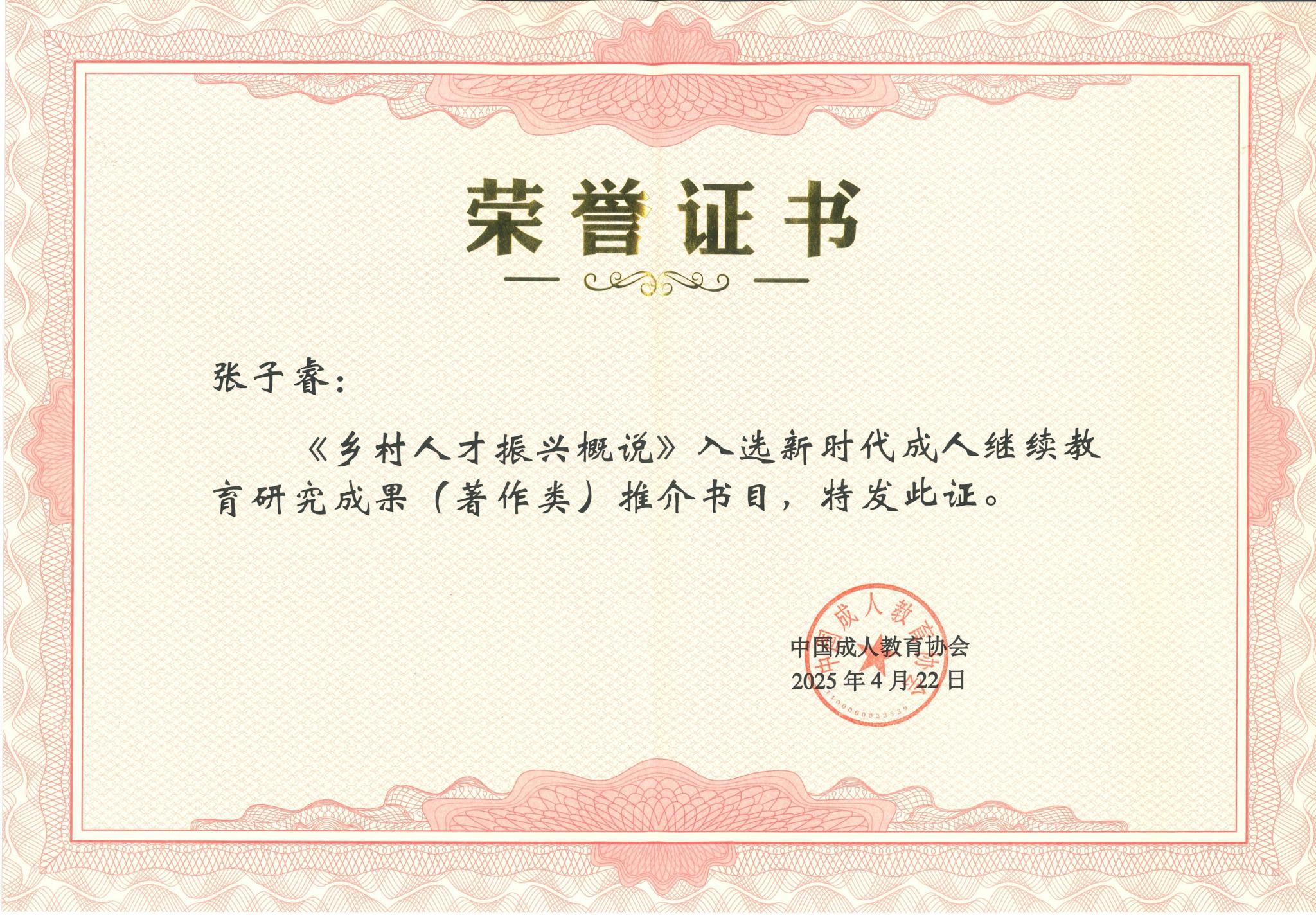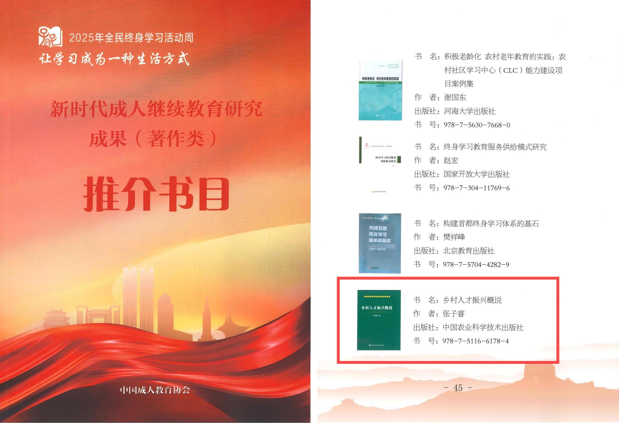 为全面贯彻党的二十大精神,认真落实建设全民终身学习的学习型社会、学习型大国的要求,中国成人教育协会和北京市成人教育学会相继发布了《关于征集新时代成人继续教育学术专著的通知》,122cc太阳成集团根据通知要求积极开展优秀成果的征集和上报工作。经中国成人教育协会专家组审定,公司张子睿老师编著的《乡村人才振兴概说》入选新时代成人继续教育研究成果(著作类)推介书目。